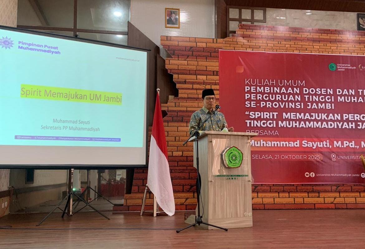 UM Jambi – Universitas Muhammadiyah Jambi menggelar Kuliah Umum Bersama Keluarga Muhammadiyah dengan menghadirkan Muhammad Sayuti, M.Pd., M.Ed., Ph.D, Sekretaris Pimpinan Pusat (PP) Muhammadiyah, pada Selasa 21 Oktober 2025 Kegiatan ini menjadi ajang silaturahmi dan penguatan komitmen antar perguruan tinggi Muhammadiyah se-Provinsi Jambi dalam mewujudkan pendidikan yang unggul dan berkemajuan.